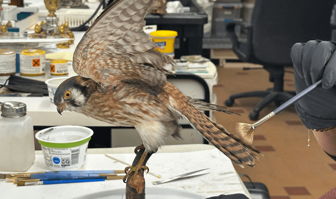 In keeping with best practices for returning taxidermied birds to their original appearance, Renee used pastels to restore coloration that had changed over time. “Even careful cleaning can’t restore colors that have faded,” Renee said, “or fix white feathers that have darkened with age. These highly pigmented pastels allow us to bring the birds back to life.”