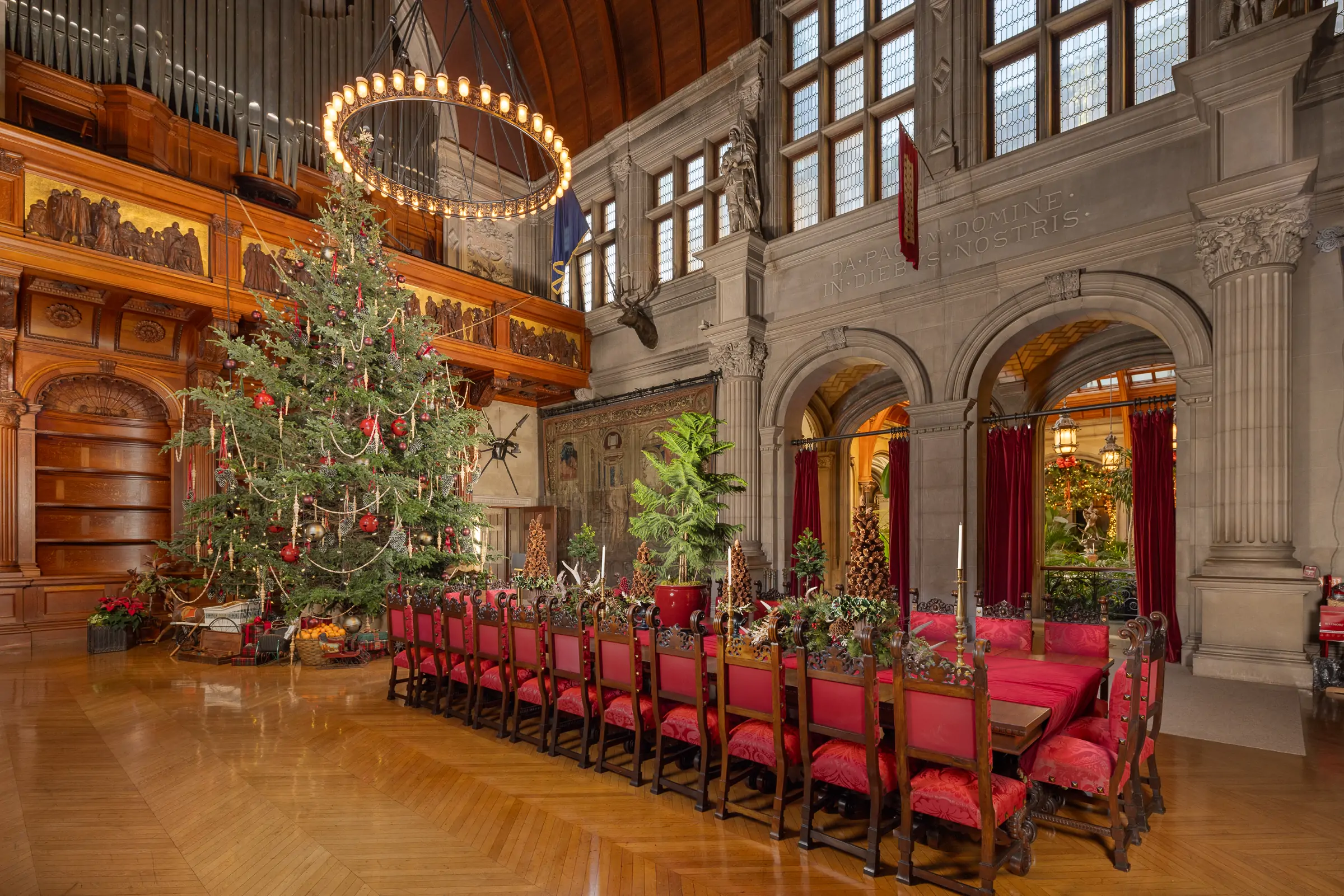 When you visit this Christmas at Biltmore, look for festive designs inspired by the Vanderbilt family’s stories, furnishings, art and objects, and architectural details. Expect classic Christmas decoration colors like red, deep green, copper, and plaid, along with natural elements like antlers, “groceries,” and, of course, holly and mistletoe.