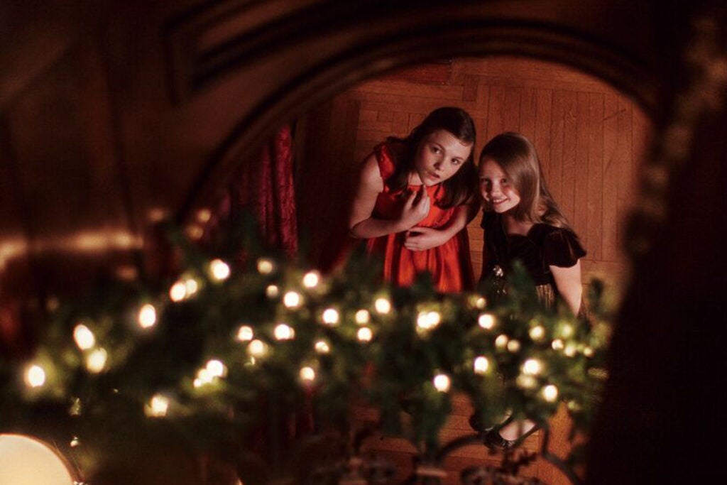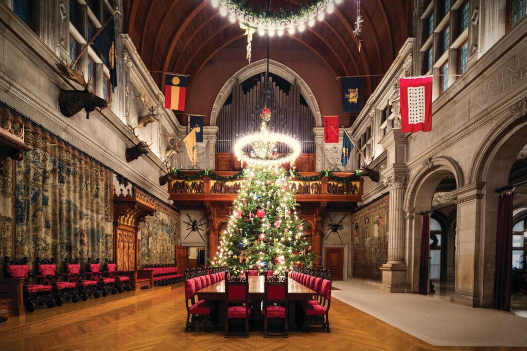 Flames dance in the Tapestry Gallery fireplace, setting a festive mood amid gently illuminated Christmas trees and stunning holiday décor.