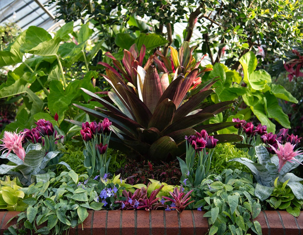 While strolling the gardens, be sure to stop at the Conservatory to see the incredible tropical displays our gardeners have created which feature Palms, Banana, Bromeliads, Begonia, Ginger, Plumeria, and Tropical hibiscus.
