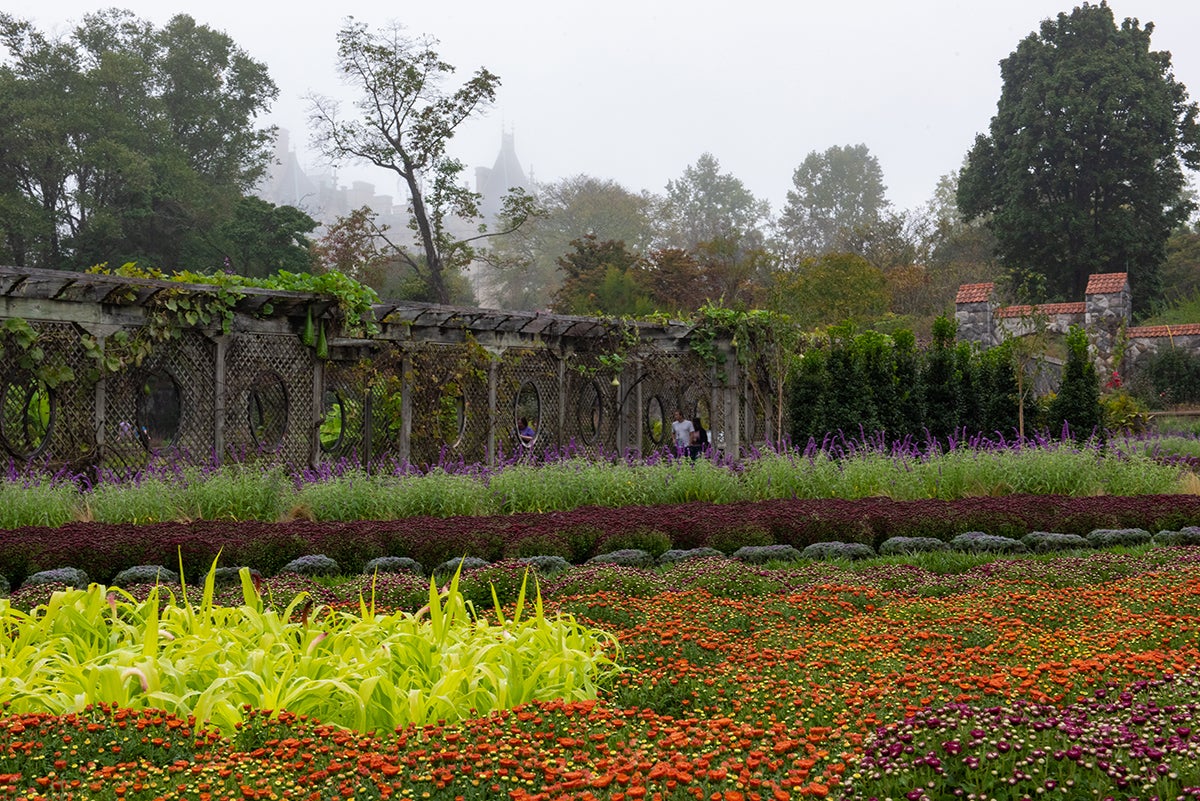 Cheerful Mums, Salvia, and Wheatgrass brighten misty mornings in the Walled Garden with a glorious glimpse of Biltmore House in the background.