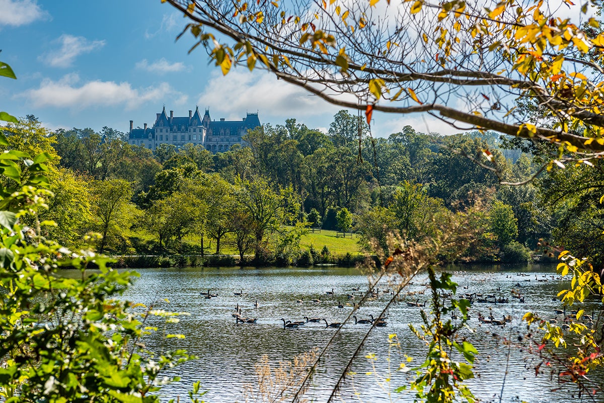 The Lagoon mirrors the ever-changing colors of fall with a beautiful reflection of Biltmore House.