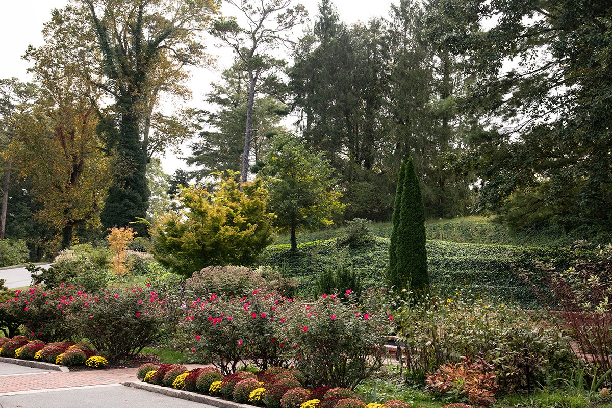 Colorful mums cluster around late-season roses in the pretty pocket garden in front of Biltmore’s Winery.